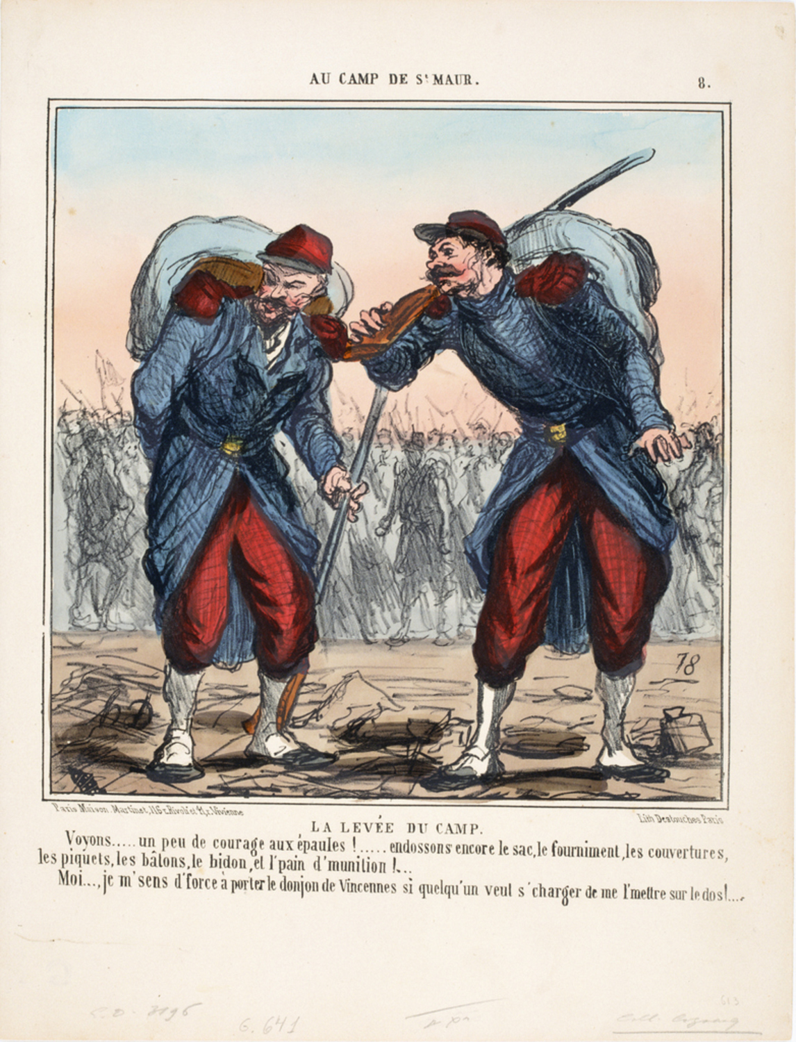 STRIKING CAMP: Look here...[put] a bit of fresh life into your shoulders!... let's put the bag, the equipment, the covers, the pickets, the cudgels, the water-bottle and the ration loaf on our backs once more!... Personally..., I feel as though I've got the strength to carry the Vincennes castle-keep, if someone would like to burden himself with putting it on my back!...