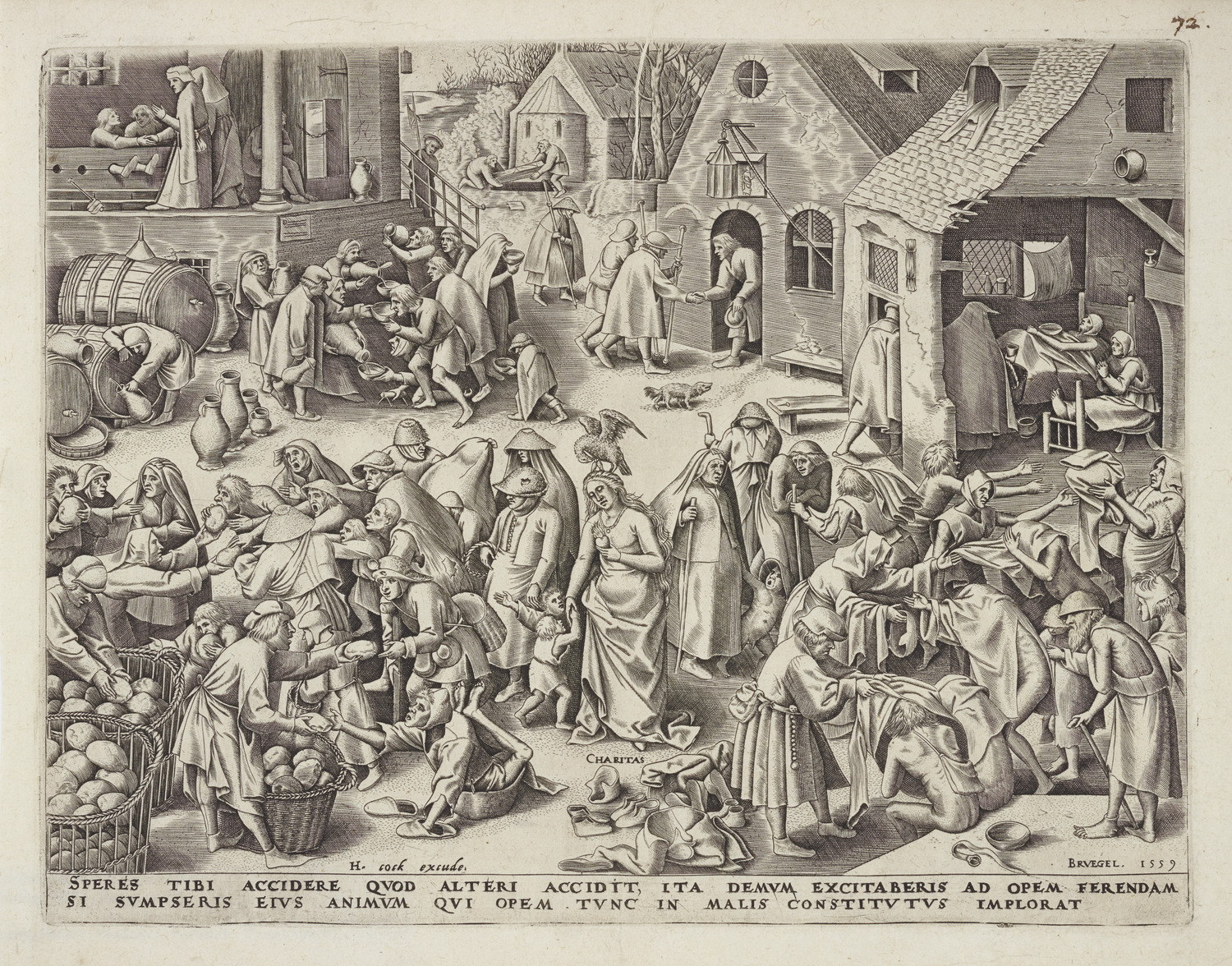 | Inscriptions | H. cock excude. (lower left); CHARITAS (lower center); BRVEGEL. 1559 (lower right); SPERES TIBI ACCIDERE QVOD ALTERI ACCIDIT, ITA DEMVM EXCITABERIS AD OPEM FERENDAM // SI SVMPSERIS EIVS ANIMVM QVI TVNC IN MALIS CONSTITVTVS IMPLORAT (lower margin). |