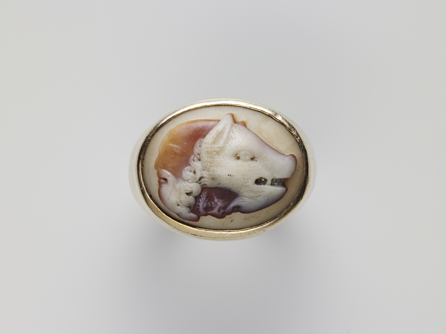 猪と二人の男性の顔を表す貝殻のカメオ Gold Ring with a Shell Cameo of a Boar and Two Bearded Masks