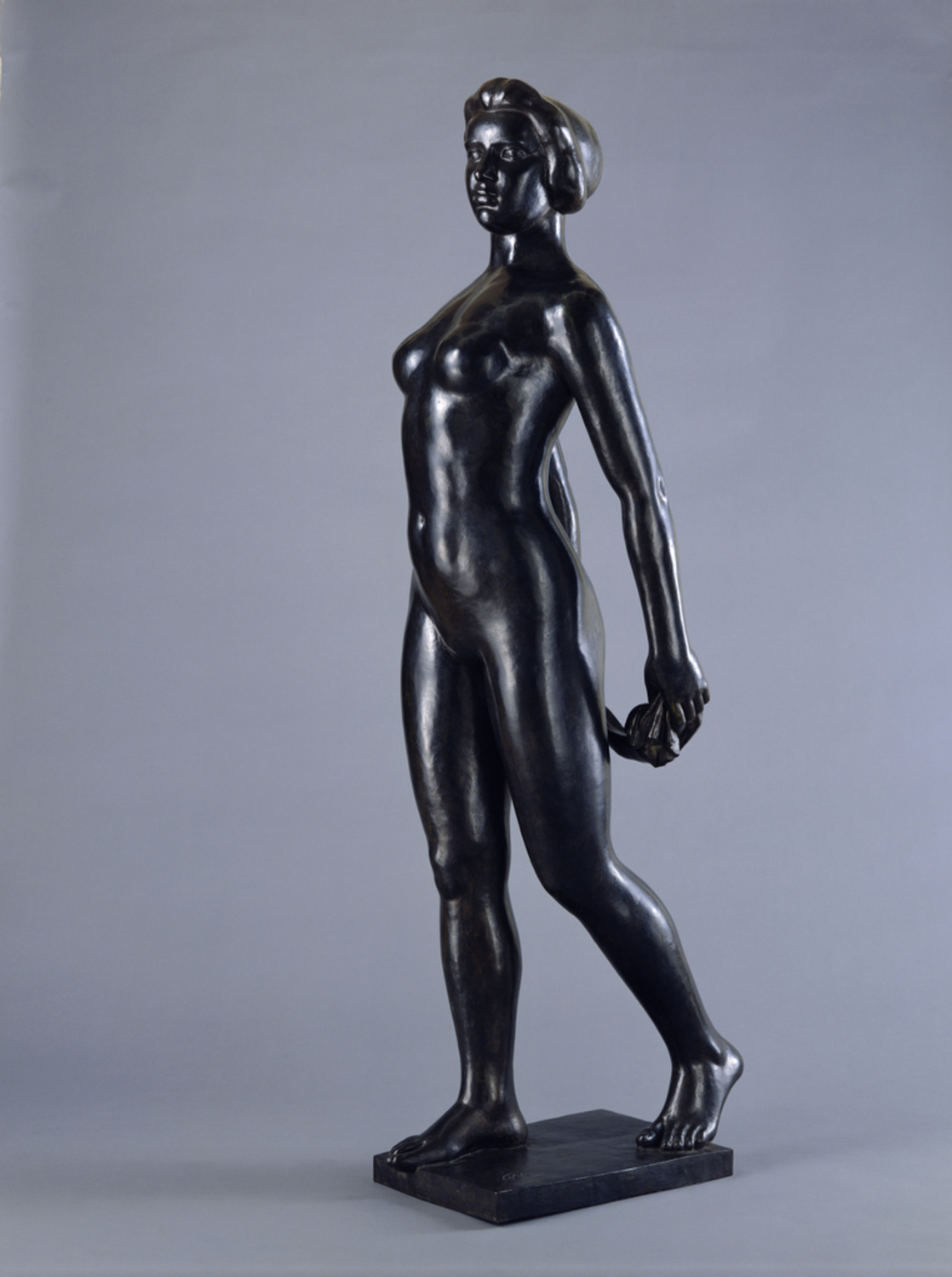 To Maillol, nature was the source of movement and thought. Nature was the one thing that he had faith in. The female form was a miniature universe encompassing the order, harmony, beauty and peace of nature. He gave nature-based names such as La Méditerranée, Mountain, River, Spring, Summer, Night, and Atmosphere to his numerous sculptures of the female form. Ile-de-France refers to the fertile land surrounding Paris which is bounded by the Seine, Marne and Oise Rivers. Maillol loved the rich nature of the Ile-de-France in addition to that of his home town of Banyuls, and he spent the majority of his life in one of these two locales. In 1910 Maillol conceived of the motif of a "Young Girl Walking in Water" and created three torso practice works of the subject before 1921. Ile-de-France was then based on these study torsos. This female form with its expanded chest, gently pulled back left leg and straight right supporting leg, does not actually walk, but rather shows the figure simply standing as it has newly emerged from the earth. The movement that arcs from the left leg up through the stomach, chest and shoulder, both arms holding a cloth that naturally stretch back from the perpendicular right leg, and the quiet poise of the head glancing to the left all contribute in a calm flowing movement. Maillol's sculptural methods are architectural rather than modelled in their creation of a synthesis of the individual forms of a human body into an ordered structure that balances contrast and harmony. (Source: Masterpieces of the National Museum of Western Art, Tokyo, 2009, cat. no. 146)