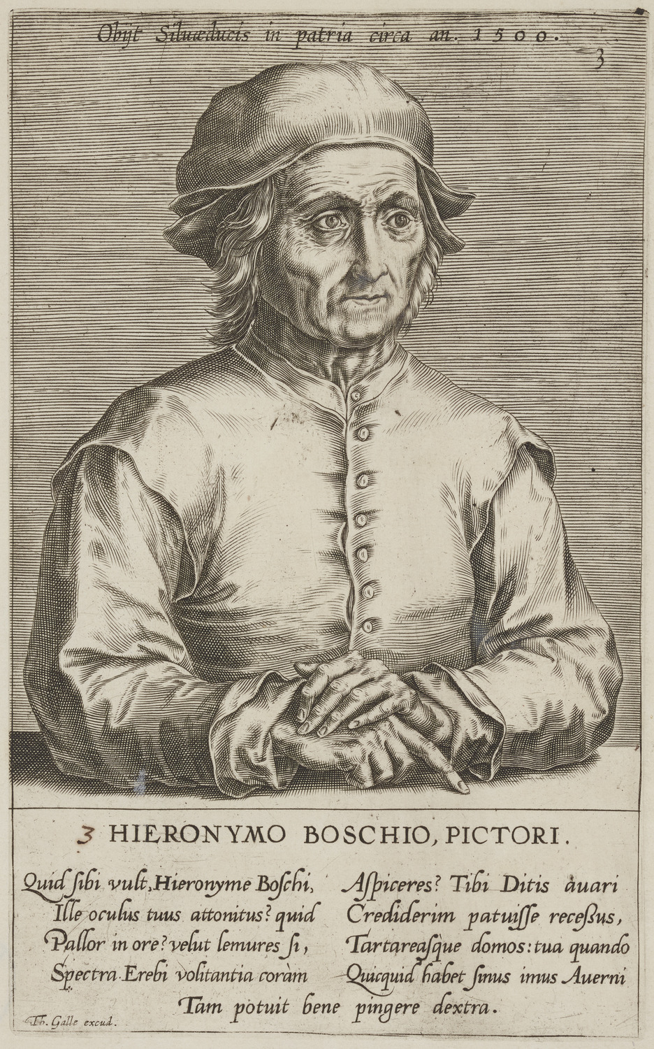 Inscriptions | Inscribed at top: Obÿt Siluaducis in patria circa an. 1500.; top right: 3; HIERONYMO BOSCHIO, PICTORI.; bottom: Quid sibi vult, Hieronyme Boschi, / Ille oculus tuus attonitus? Quid / Pallor in ore? velut lemures si, / Spectra Erebi volitantia coràm / Aspiceres? Tibi Ditis auari / Crediderim patuisse receßus, / Tartareasque domos: tua quando / Quicquid habet sinus imus Auerni / Tam potuit bene pingere dextra.; bottom left: Th. Galle excud. |